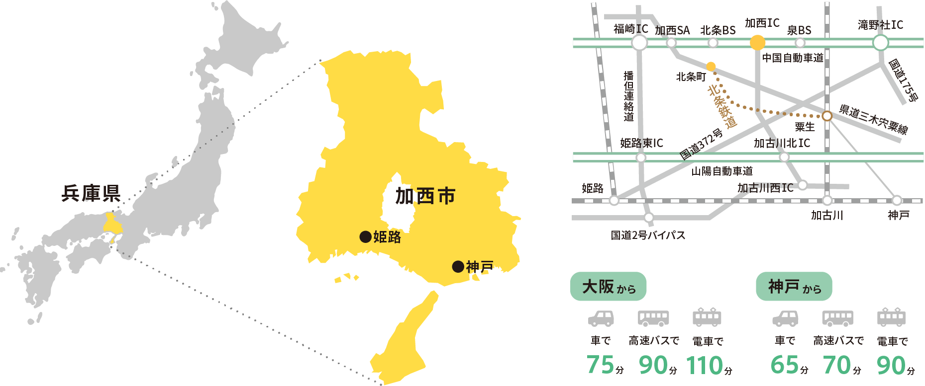 温暖で穏やかな瀬戸内海式気候で過ごしやすく、北条鉄道がJR・神戸電鉄に接続し、 高速バスなら大阪まで90分と都会とのアクセスも良好で、自然と都市とのバランスのいいまちです。
