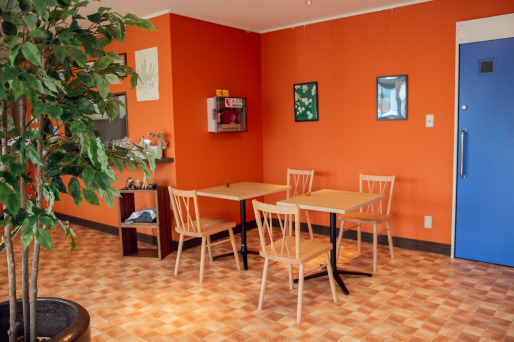 オレンジ色の壁紙にフロアタイル、ナチュラルウッドテイストの家具。あたたかい光が降りそそぐ、大きな窓。本棚には「陽文庫」の販売する古本が並び、料理を待つ間についつい手に取って読み始めてしまう。車イスやベビーカーでも通りやすいように十分なスペースが空いている店内には、“おもてなし”の心が随所に感じられた。