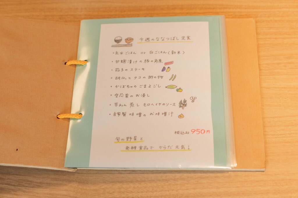1日25食限定、内容は週替わりの看板メニュー「ななつぼし定食」には味噌や麹、醤油などの発酵食品を使った料理と旬の野菜料理が必ず入っており、厨房からは食欲をそそる匂いが漂う。