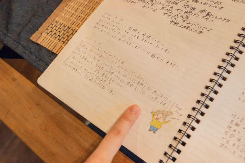 2階にはお洒落なキッチンスペースがある。そこにある1冊のノート。お客様からのメッセージが記されている。「最初は『お布団がふわふわ』って書いてある人が多かった」これまでのお客様を思い出すかのようにノートをめくる岩國さん。ホスピタリティという言葉に目が留まる。「他には『私も自分の夢を実現できるように頑張っていきたいです』とか」