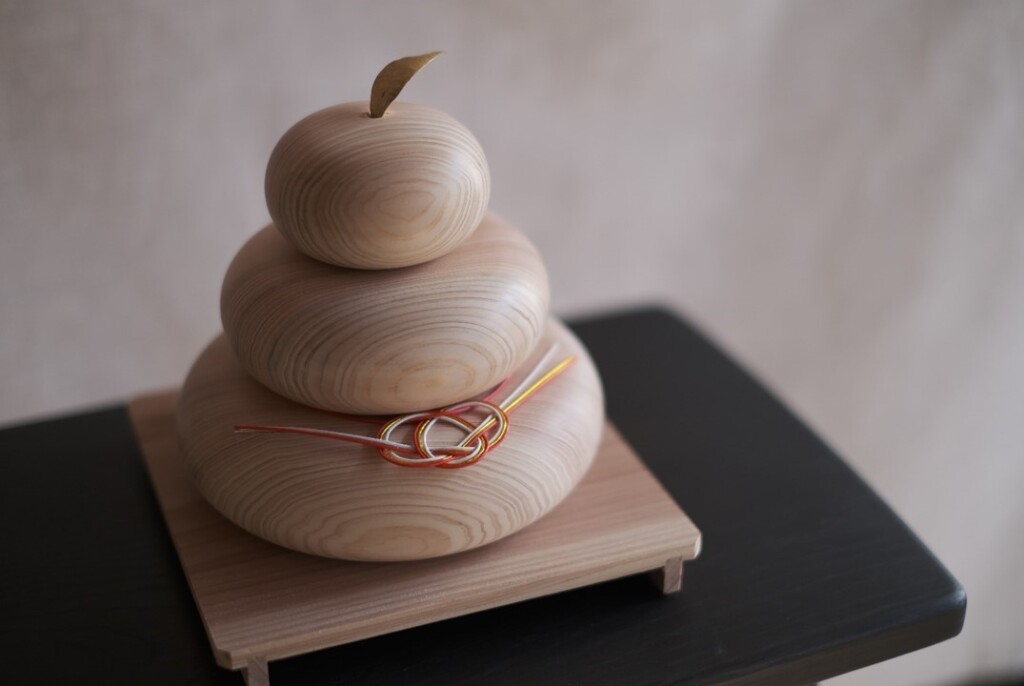 それで試行錯誤して、ようやく製作化まで辿り着いたのが、間伐材で作った「鏡餅」です。伝えたいメッセージをリーフレットに込めて、箱もしっかりと作っています。1年中、飾って頂いてもいいんですが、1年に1回しか出さない方もいらっしゃるので、きちんとした箱にしまわれていれば、世代を超えて大切にしてもらえるかなと思ってこだわりました。鏡餅にかけている水引も妻が作ってくれています。